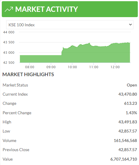 The KSE-100 index surged to 43,470 points with 613 points gain (1.43 percent). The volume of shares trading stood at 161.546 million involving 6.707 billion rupees. The KSE-100 index’s high level was 43,491 points on Monday and 42,857 points low level, indicating 634 points fluctuation in the index.
