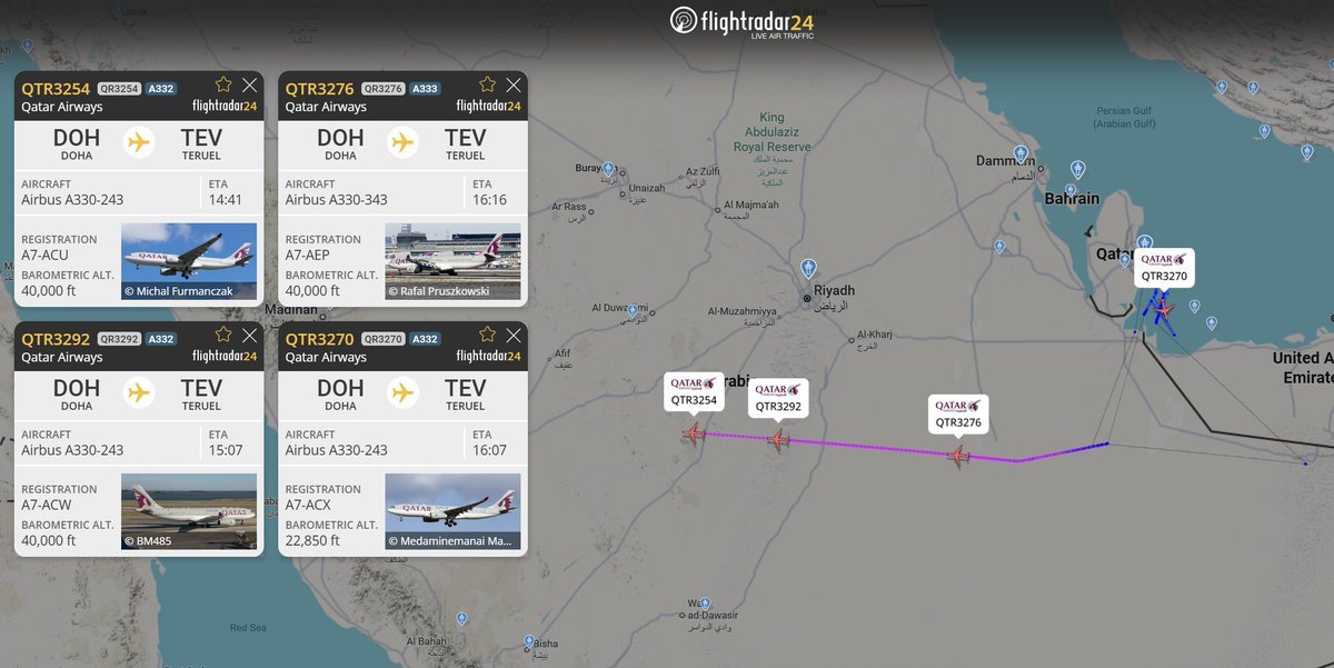 Twitter Text: Qatar Airways is flying four A330s to Teruel, Spain, likely for storage.