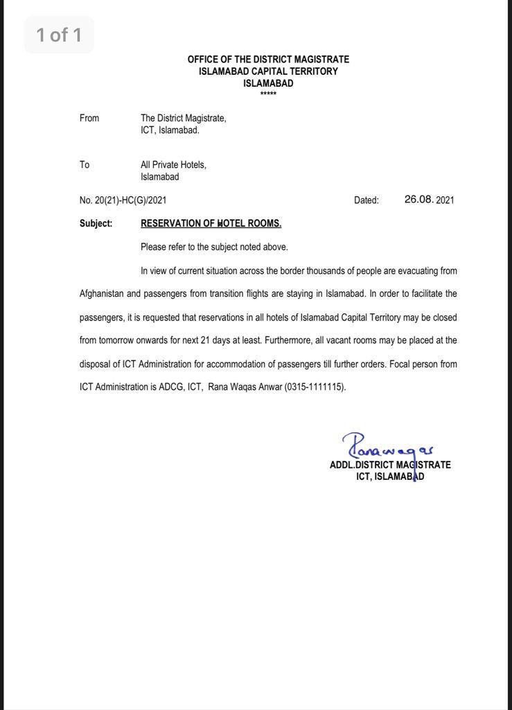 Therefore, in order to facilitate the foreign passengers arriving from Afghanistan, all hotels in Islamabad are directed to stop local reservation of rooms for at least 21 days with effect from Aug 27, 2021.