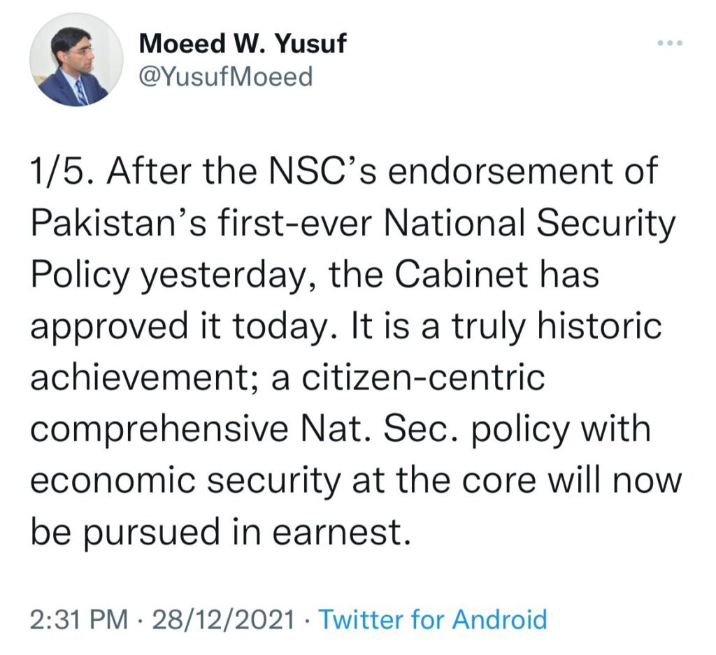 Earlier, the National Security Committee approved Pakistanโs first-ever National Security Policy (NSP) 2022-2026on Monday (Dec 27). Prime Minister Imran Khan, who chaired the meeting, termed the approval of policy a historic moment for Pakistan.