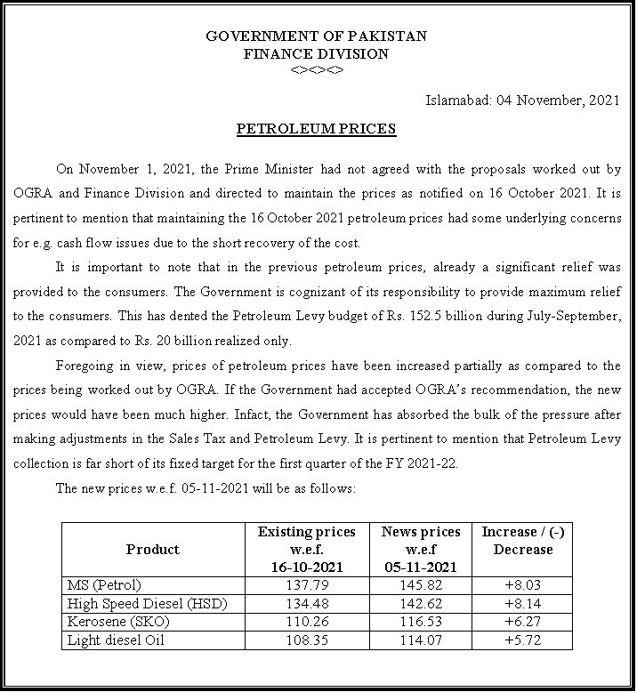 “Foregoing in view, prices of petroleum prices have been increased partially as compared to the prices being worked out by OGRA.”