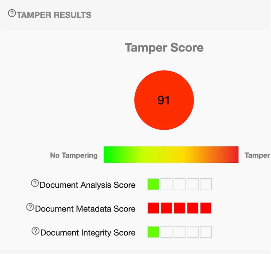 The tool assigned the document a Tamper Score of 91, indicating a high likelihood of forgery. The analysis revealed that the document had been manipulated and did not originate from an official source.