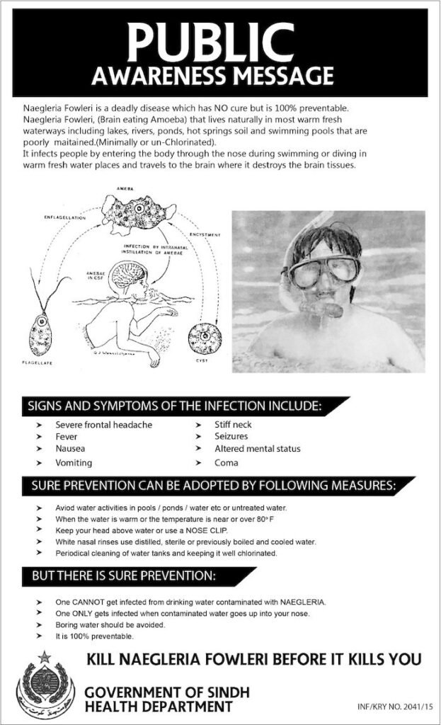 Doctors and health experts say Naegleria usually enters the brain and attacks the nervous system when infected water is ingested through the nasal cavity while bathing, swimming or performing ablution.