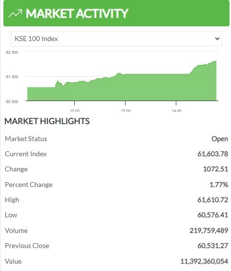 ISLAMABAD: Bulls regained their dominance at the Pakistan Stock Exchange (PSX) as the KSE-100 index surged past the 61600 points, witnessing a notable leap of over 1,070 points during Friday’s trading session.
