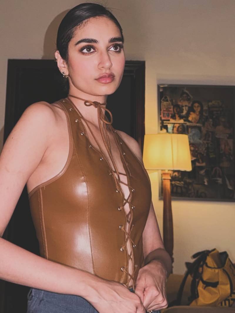 In the photos, Mamya embraced a bold and edgy aesthetic, stepping confidently into a biker-chic fashion vibe. She wore a tan, high-shine faux leather halter top featuring a deep V neckline and a lace-up corset design accented with metallic detailing. The outfit projected a strong fashion-forward statement while maintaining a modern, urban edge.