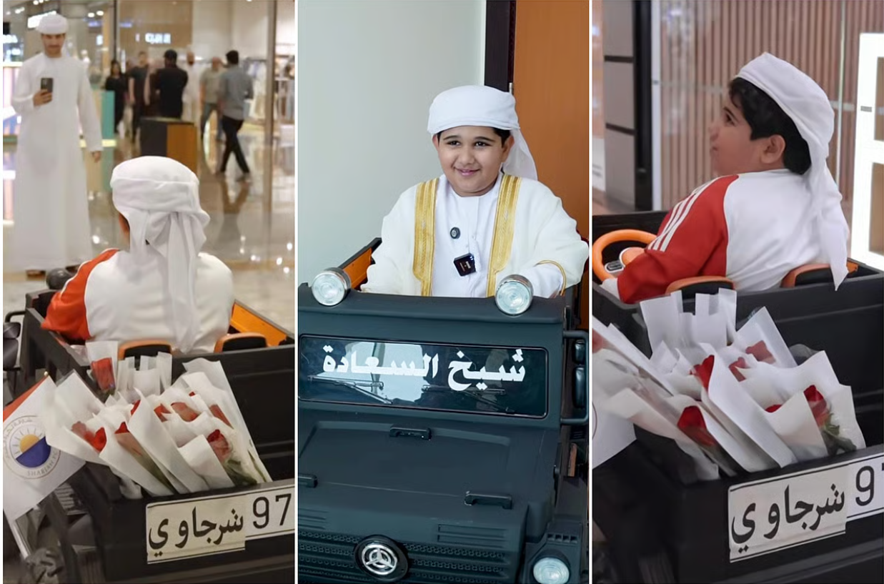 In the UAE, an 8-year-old Emirati boy named Majed Omar has become widely known as the “Sheikh of Happiness” for his heartwarming mission to bring smiles to people’s faces. Driving a miniature black Mercedes with a national 971 number plate, Majed tours institutions, offering red roses and kind words to brighten employees’ days.