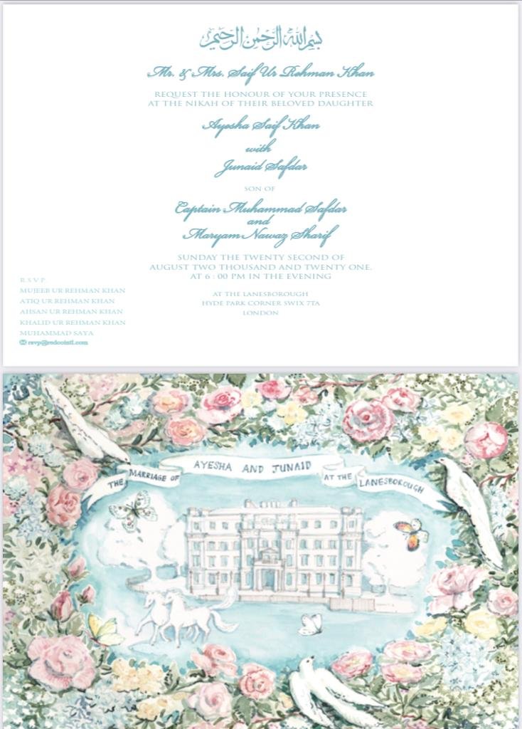 According to the wedding invite shared on Twitter by the PML-N leader, the nikah of Junaid Safdar with Ayesha Saif Khan, daughter of Mr and Mrs Saifur Rahman Khan, will be arranged on August 22 in London.