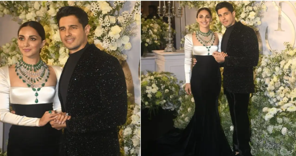 Sidharth is dressed in a gleaming black suit, while Kiara is dressed in a gorgeous black and white gown.