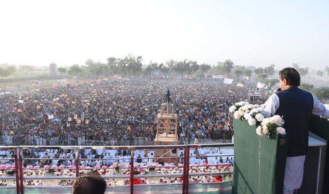 The prime minister took the podium after his fellow PTI leaders took turns addressing their party workers and supporters, who have assembled at his call ahead of a no-trust move against him in the National Assembly.