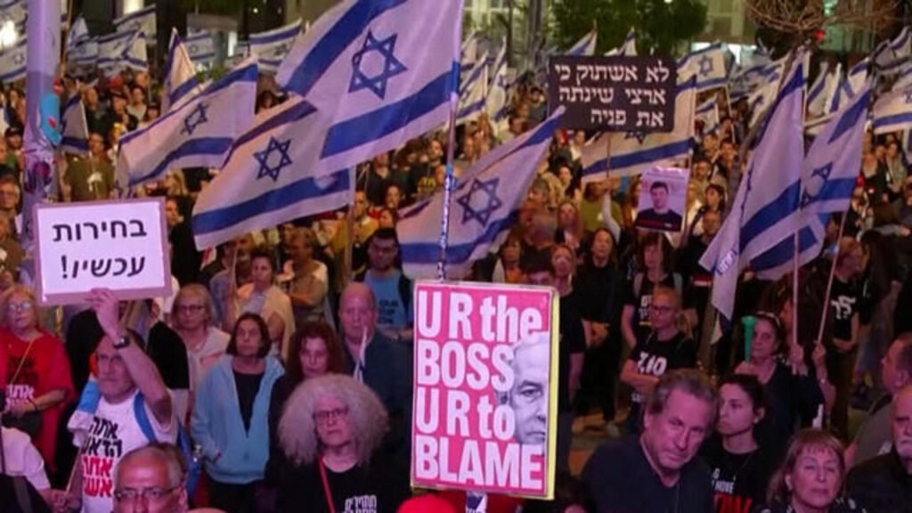 Tens of thousands of protesters, waving Israeli flags and chanting slogans against Prime Minister Benjamin Netanyahu’s government, gathered in Tel Aviv. They demanded new elections and the release of hostages held in Gaza.