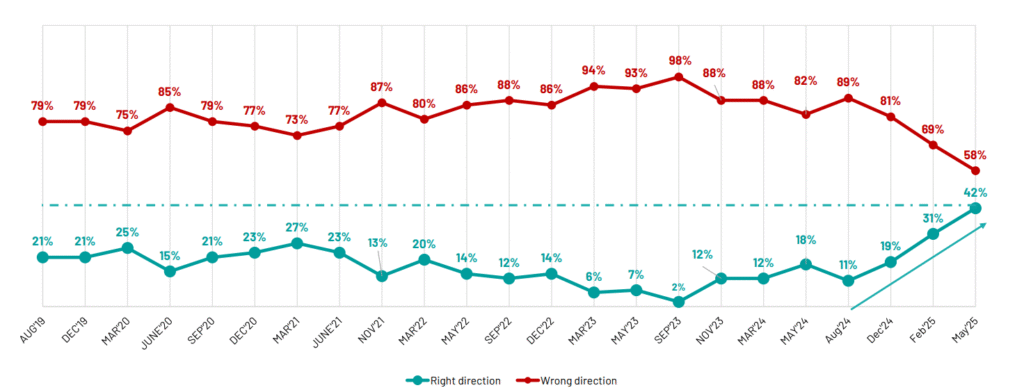 Pakistan has seen a notable rise in public optimism, with 42% of respondents now believing the country is headed in the right direction, according to the Q2 2025 Ipsos Consumer Confidence Survey. This marks a significant improvement from just 31% in February 2025 and a dramatic turnaround from the low of 2% recorded in September 2023. The current optimism level is the highest in six years.
