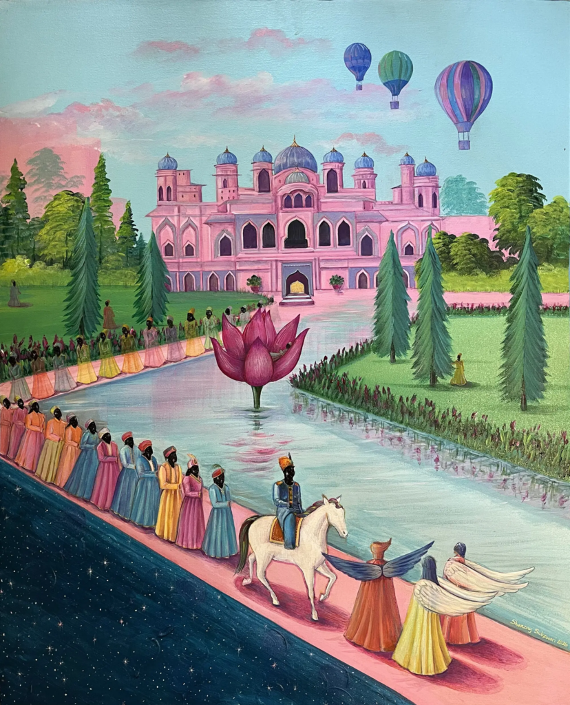 Shanzay Subzwari fills her canvases with soft pinks, luminous blues and pastel hues. She calls them her “comfort colours.” These bright tones create a quiet sense of solace instead of mourning. Furthermore, she blends the flattened perspective and jewel-like detail of Mughal miniatures with modern symbols. These include floating hot air balloons that represent souls in transition. In one painting, a rhythmic procession of anonymous figures walks along a body of water. A lotus blooms at the centre, hinting at rebirth and transcendence.