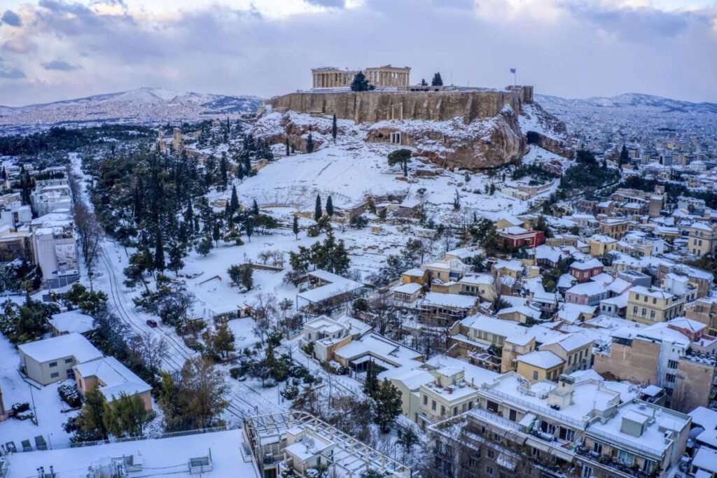 As snow blanketed the city of Athens amid a storm named Elpida, which means โhopeโ, the temperature plummeted to -14 degrees Celsius overnight. The Greek government declared a holiday in Athens on Tuesday after snow disrupted road, rail and air travel. Many schools were closed.