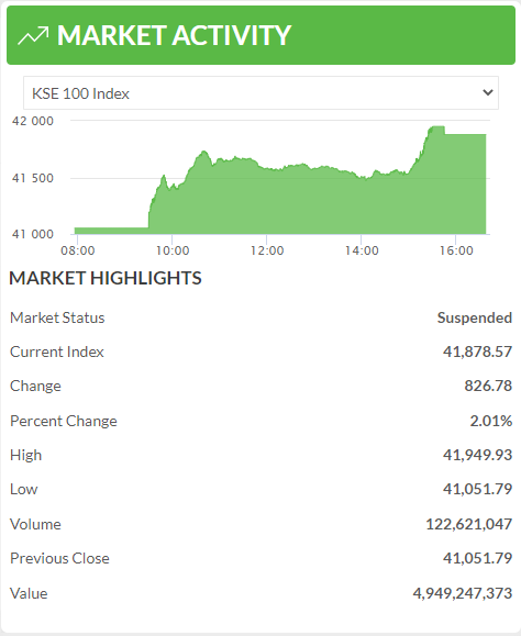 The KSE-100 index surged to 41,878 points on Monday with a net gain of 826.78 points _ 2.01 percent while the volume of shares amounted to 122.621 million, involving an amount of Rs4.949 billion. Today’s lowest level of KSE-100 index was 41,051 points during intra-day trading and it surged to 41,878 amid speculative buying spree.