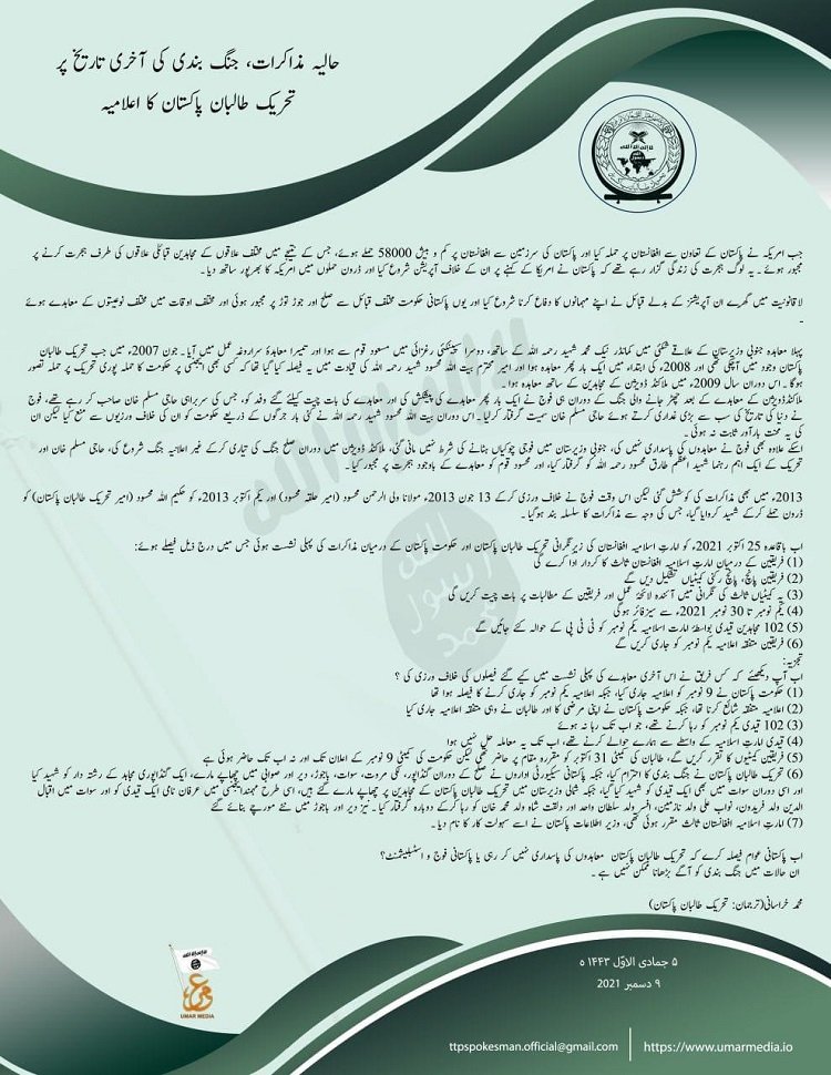 According to TTP, the government and TTP developed an understanding for a ceasefire under the aegis of the โIslamic Emirate of Afghanistanโ (IEA) on Oct 25, 2021.