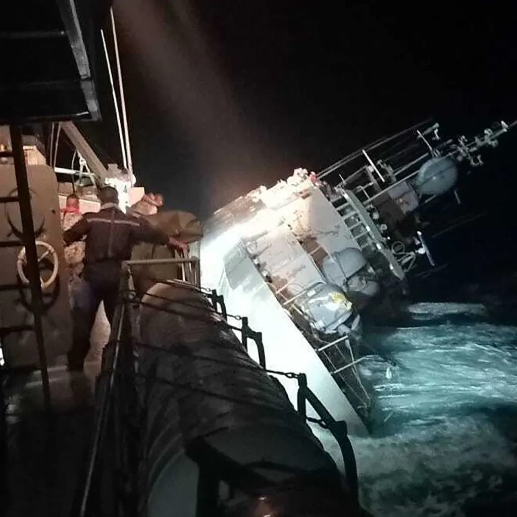 Officials said the ship went down after it took on water, which flooded its hull and short-circuited its power room. With the power lost, the crew battled to retain control of the ship which listed on to its side before sinking around 23:30 local time Sunday (16:30 GMT).