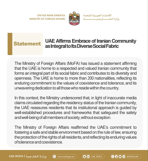 This clarification has been issued in the wake of the tensions in the region due to the ongoing war between Iran, the United States, and Israel. The Iranians have lived and worked in the UAE for generations in the business and trade sector.