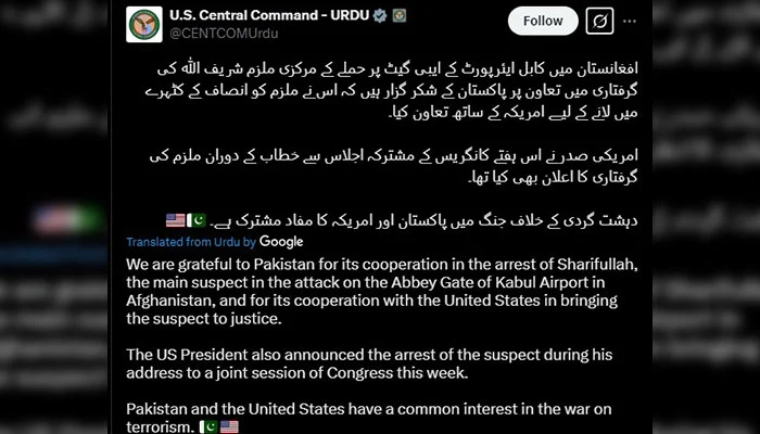 In a post shared on its official Urdu-language handle on X, US Centcom acknowledged Pakistan’s role in the arrest of Sharifullah, who was the key suspect in the deadly attack at the Abbey Gate of Kabul Airport. “We are grateful to Pakistan for its cooperation in the arrest of Sharifullah, the main suspect in the attack on the Abbey Gate of Kabul Airport in Afghanistan, and for its cooperation with the United States in bringing the suspect to justice,” the statement read.